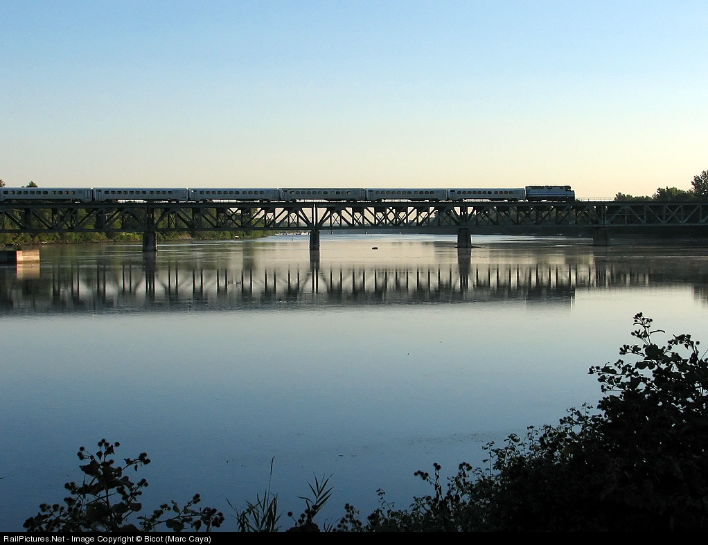 Bridge is hiden from the sun at sunrise by the Mount St. Hilaire silhouetting the commuter train.
