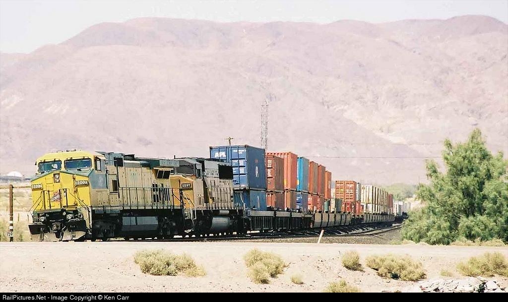 CNW 8602 a Westbound UP stack waits for the signal at Daggett. Five hours after last seeing this train at Kelso, and traveling over 155 miles, we once again meet up with it at Daggett, as it waits