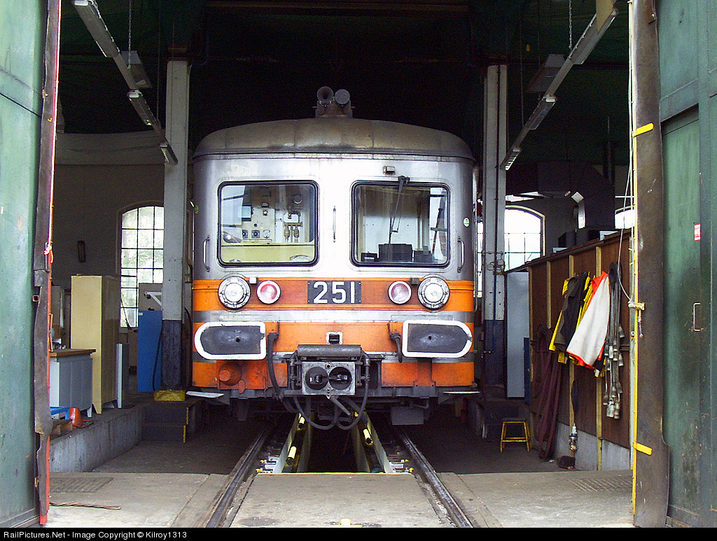 Electric railcar CFL Z 251 inside the roundhouse on the maintenance pit.