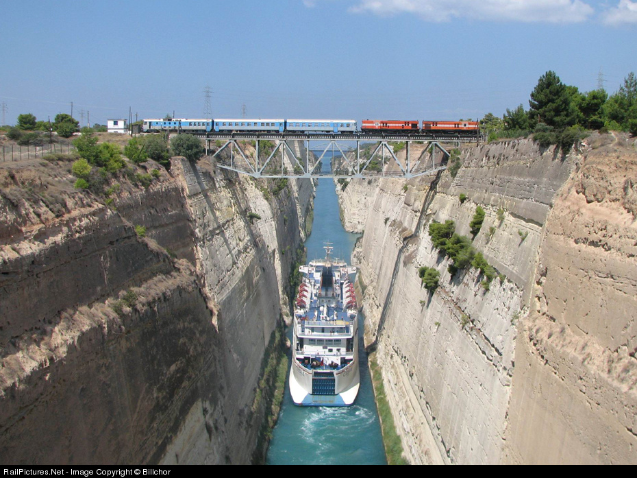 | A pair of Alcos ,A9406 and A9111, led on a dmu unit.This passenger train will do the next day the excurcion for European railfans ,from Athens to the south. After 2 years a passenger crossing this unique bridge.I suprised when i see the cruise ship and i pleased the train drivers by the radio to stop the train for a minute and i thank them for this shot. |