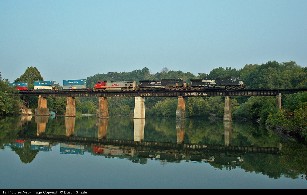 A fairly short NS 236 crosses the Holston River with a very nice BNSF Warbonnet GE trailing