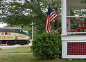 Train #1 takes the wye (the interchange with Guilford) at Brunswick under cloudy skies just as we pull into town after a morning drive from Massachusetts. With partner-in-crime #488(FL9) in the shops at Rockland for service, the excursion is forced to use the wye instead of the typical pull-pull setup or locomotive run-around.