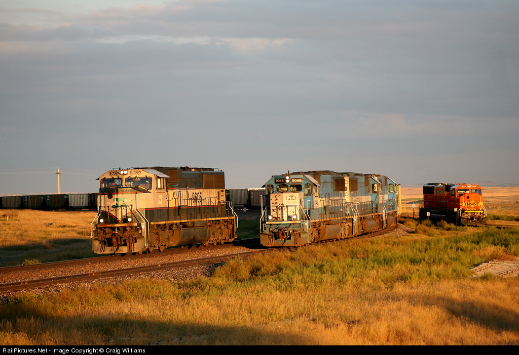 | BN 9605 has just cutoff from shoving a loaded coal train to Fryburg. They are now waiting for this westbound empty depart Fryburg so they can go over to the back track to pickup the BNSF 8214. The 8214 is helper unit that was tied down here because the crew didn't have time to make it back to Glendive. In the siding to run west 1st is this ECOBSCM with a trio of Oakway SD60's. |