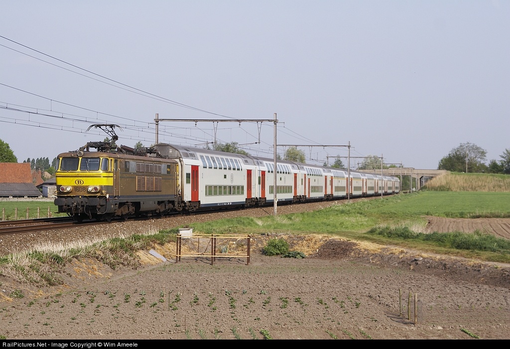 | Rush hour train from Brussels towards Ostend. Golden locomotive 1608 in front of these M6-carriages. |