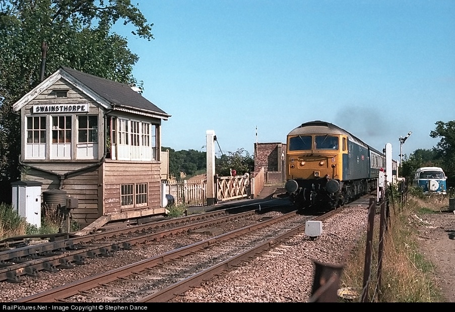 | 47 579 accelerates past Swainsthorpe box and the remains of the station with the 10:17 Norwich - Liverpool Street. Despite being closed for 30 years, the platform and building remain. Another transport classic is visible on the right |