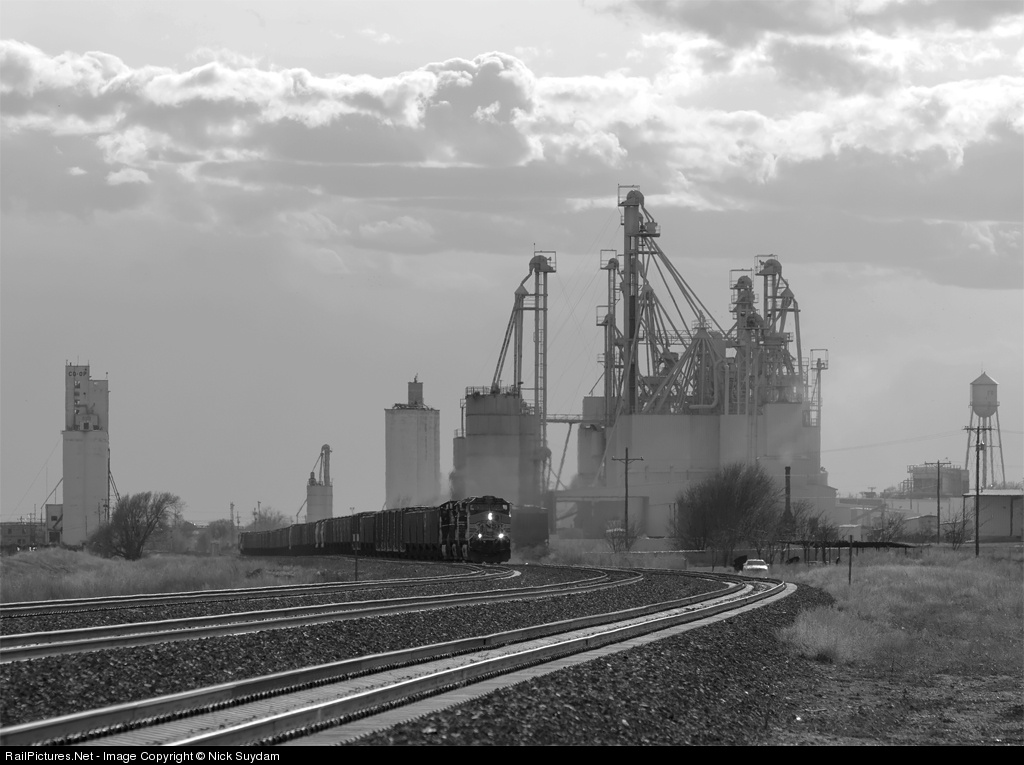| As storm clouds gather at the New Mexico border, an eastbound BNSF grain train makes it's way through Friona, TX, heading for Amarillo. |