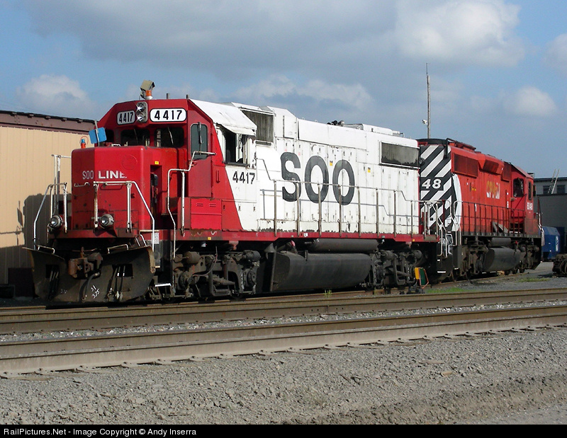Soo 4417 sits with a CP SD40-2 at the shops...