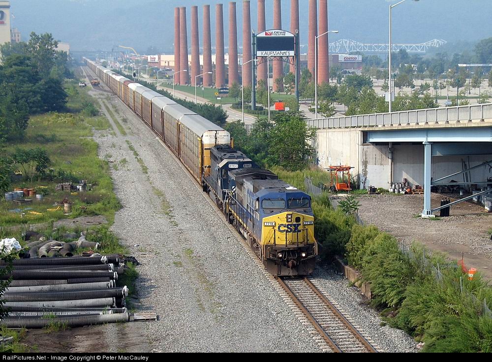 CSX 7718 and HLCX 8160 lead an autorack train slowly through Pittsburgh while track crews patiently wait. On a side note, at the exact moment I took this photo, a semi rig ran a red light, hit a box van, and pushed it into a Volvo on the bridge that I was standing on. Really.