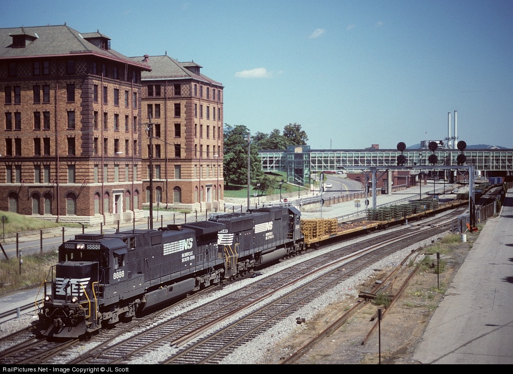 The last standard cab D9-40C (wide cabs start at 8889) and SD70 2541 head west through downtown Roanoke, as seen from the First St. bridge. Old N&W offices are to the left, while the pedestrian bridge between the city maket and Hotel Roanoke and the stacks of the boiler house at Roanoke Shops are seen in the background.