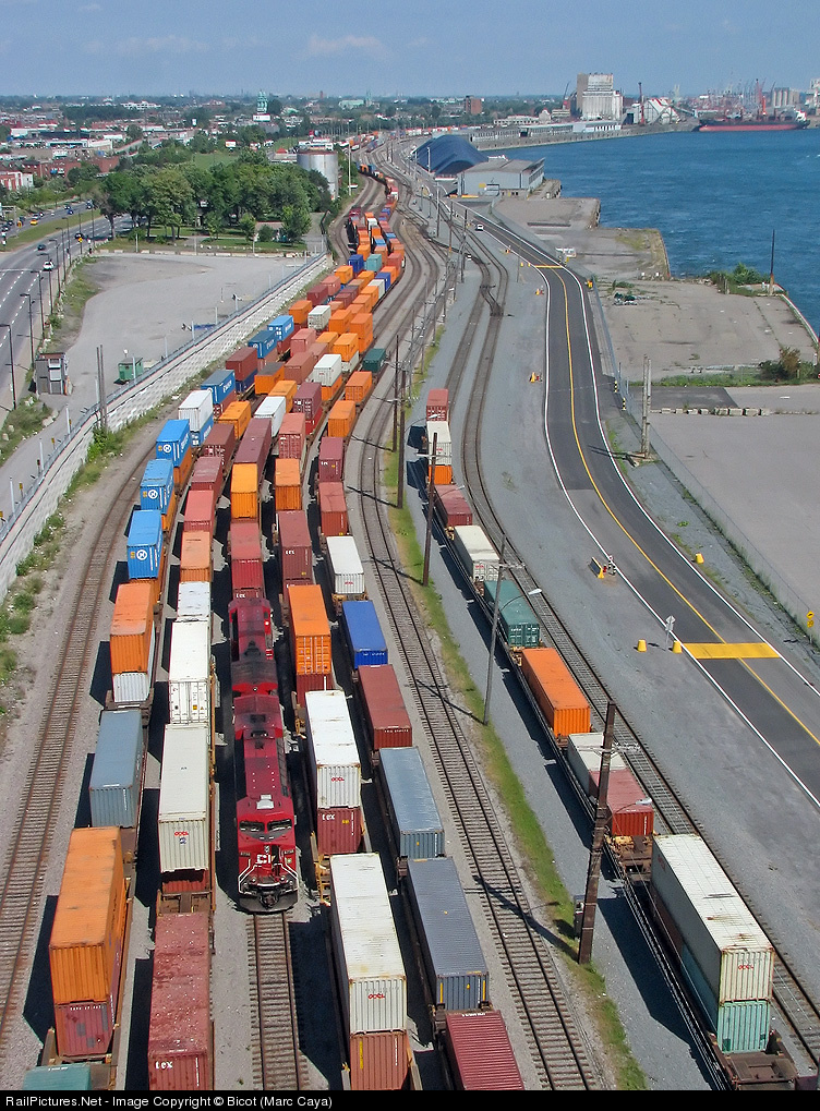 | Plenty of action: a set of CP toasters on the forefront are bringing in a hefty string of intermodals from the St-Luc yard while another one a little further is picking up the string on the left. Hardly visible is the "port de montreal" blue and yellow switcher and slug. Picture taken standing on the Jacques-Cartier bridge. |