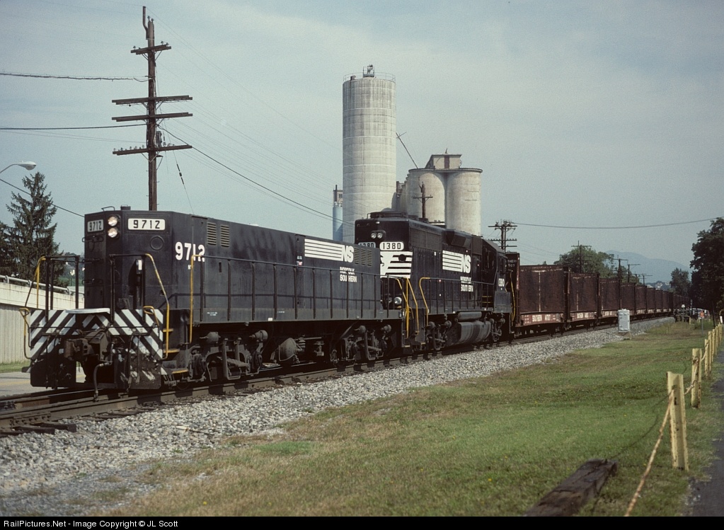 Slug 9712 and GP40 1380 at South Jefferson St. with Roanoke City Mills in the background. NS 9712 was built at Roanoke Shops in 1983 and later renumbered to 912 to accomodate the delivery of new GEs that would go as high as the 9900s.