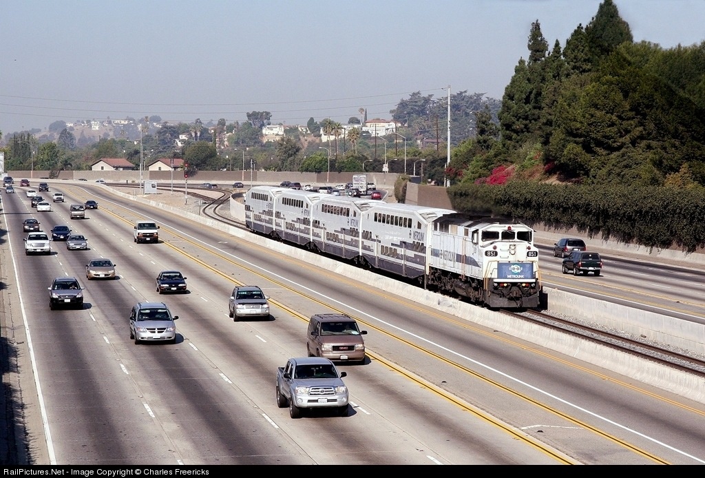 | Metrolink to San Bernardino runs through the middle of the I-10 Freeway, as seen from the Marguerita Footbridge. The lane closest to the tracks is the El Monte Busway. The train is hauling LA County Fair attendees. The track is originally a Pacific Electric line making this string of Bombardier bi-levels the successor to the Big Red Car. |
