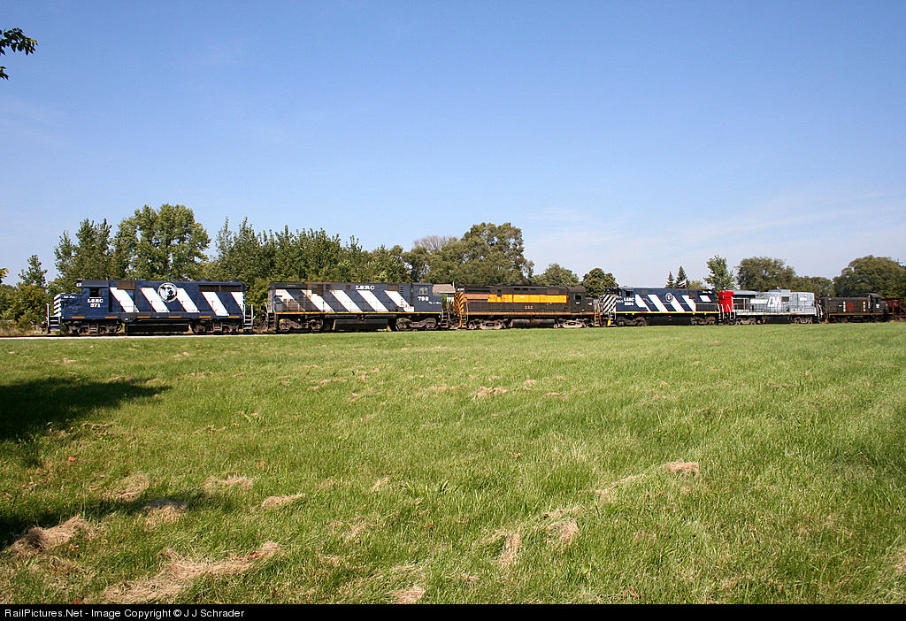 | Lake State Railway train 301 departs Bay City with a rather unusual assortment of locomotives including a leased Huron and Eastern B30-7AB engine. The train would later split the engines into two seperate consists. |