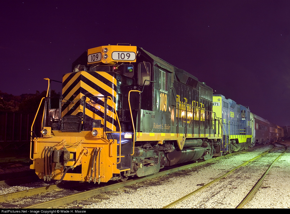 | Laying over at Rook for the night, the ORHS train is tied down behind the Wheeling's latest creation, lo-nose GP35-3 rebuild #109. |