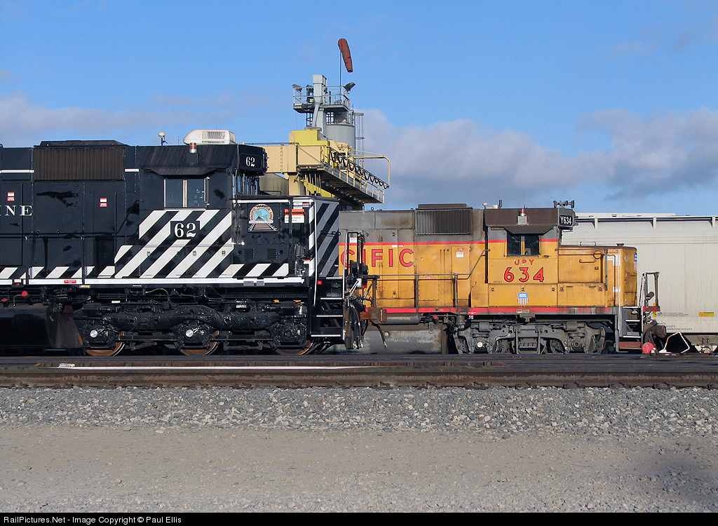 In post-storm morning light, Pacific Harbor Lines MP20C-3 62 rests alongside a veteran Union Pacific GP15-1 at UP's Dolores Yard.