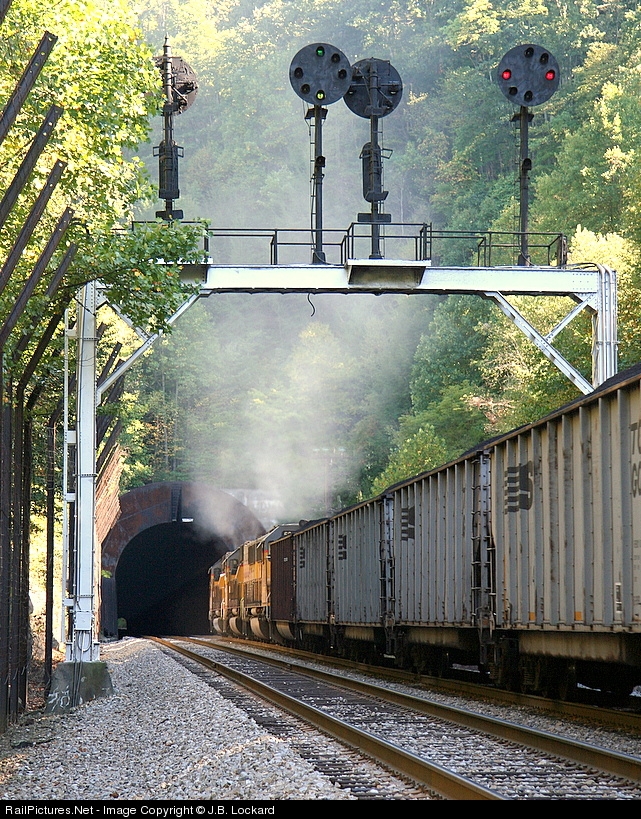 Three SD 60's are down on their knees trying to conquer the world famous Pocahontas grade. The train had three helpers on the rear.