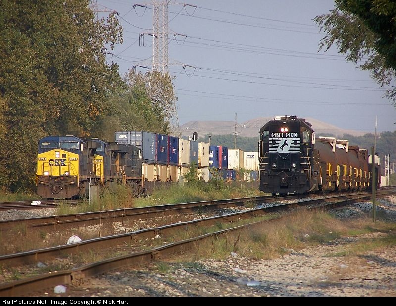 | NS 5140, in charge of the ISG bottle train, waits for cross traffic on the UP Villa Grove Sub to clear as CSX 671 overtakes it, bound for Barr Yard. |