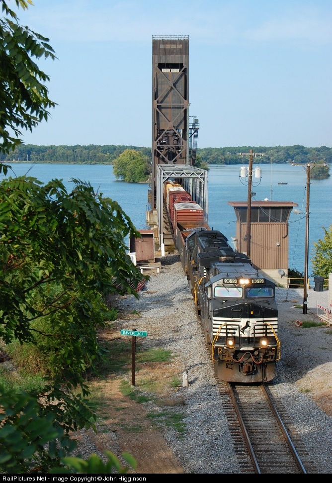 | 163 crosses the Tennessee River on a fine late summer evening. On the other side of the river, to the far left of the photo, you can see the solar panels that supply electricity to the signals at the south end of Harris on the CSX S&NA North Subdivision. |