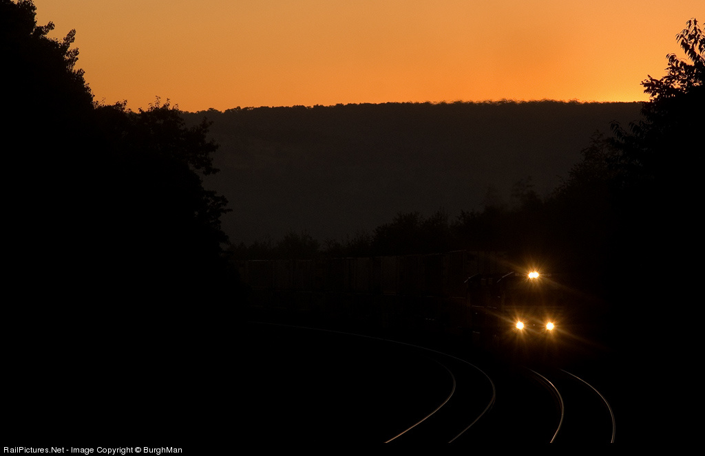 The sun has yet to rise over the Allegheny Mountains as westbound train 21G struggles upgrade at MP 247.