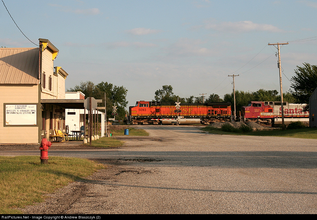 | BNSF 5093 brings up the rear of an intermodal through downtown Cassoday, KS, which has a whopping population of 110 and yet gets it's own ext off of I-35. The photographer was caught off guard by the DPU's on this westbound intermodal a practice that is not done in the Northeast. |