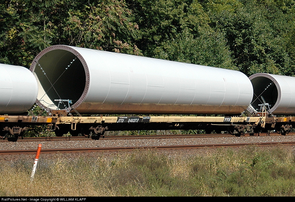 Close up of wind turbine stand on flat car, see photo of train at; http://www.railpictures.net/viewphoto.php?id=203218