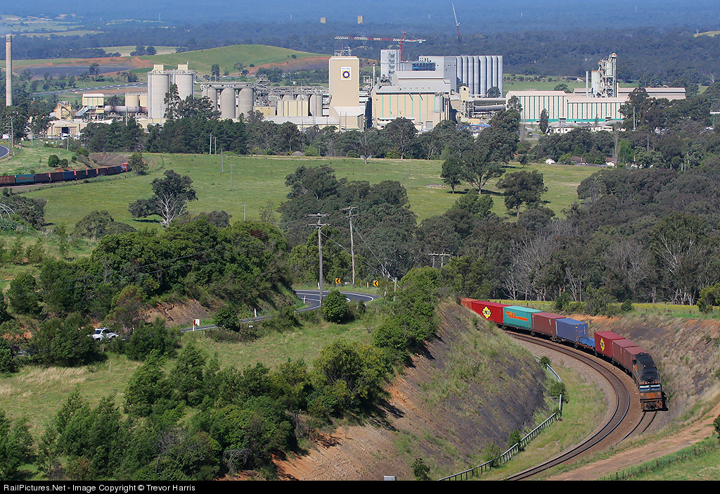 | Coming around the curves at Picon on freight run from Brisbane-Melbourne,Maldon cement works in background also the construction cranes noticable with the construction of the new grain factory.