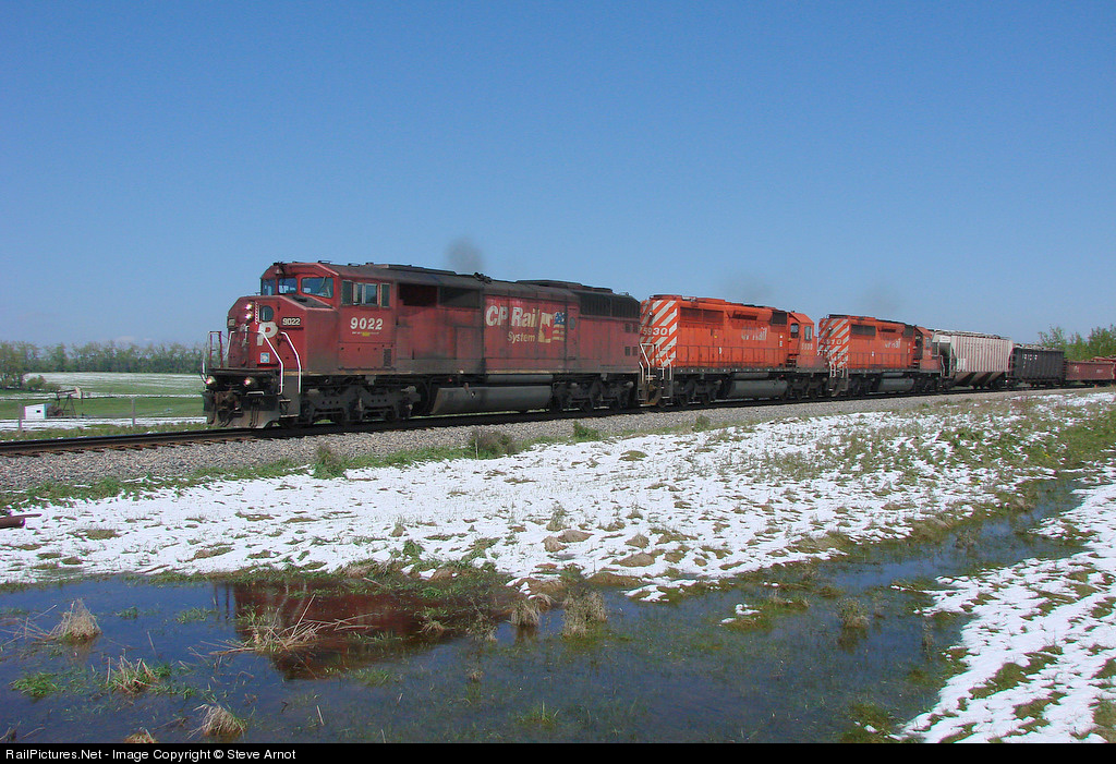 | CP 9022, 5930, and 5910 lead a Calgary bound freight on the Red Deer Sub. |
