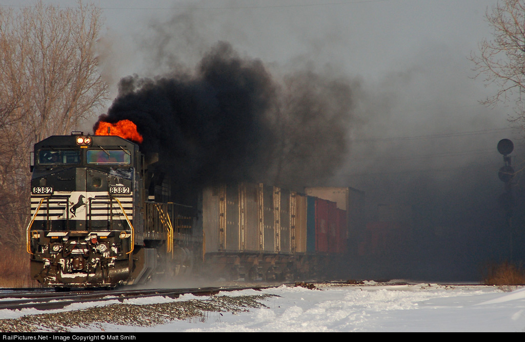 Norfolk Southern intermodal train 22W, is crossing the diamond at CP 285, leaving Toledo, Oh., with NS 8382 throwing flames and smoke, hiding the second unit NS 9360 and the train, as it passes east in Northwood, Oh.