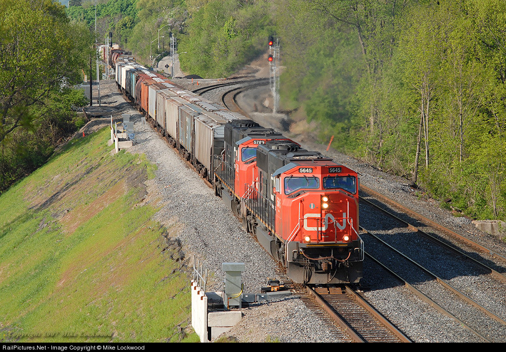 | A pair of CN SD75I's, 5645 and 5789, pass through Bayview Junction as they lift train 338 up the grade from Hamilton, Ontario. 0847hrs. |