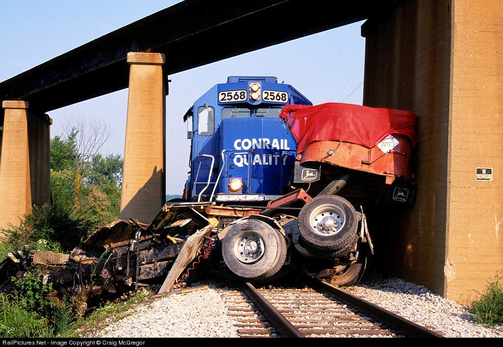 NS train D45 got an early start out of Peoria this morning but didn't make it too far before hitting this gravel truck and then wedging it under the TP&W viaduct at Farmdale. The train continued on a little later in the morning, but the truck was done for the day. Note: The train crew was ok (standing by me while I took photos) and the truck driver survived since he was throw from the cab on impact.