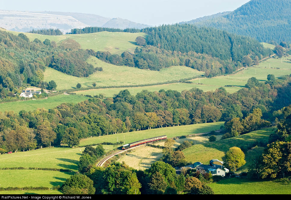 With Castell Dinas BrĂ¢n and Trevor Rocks visible in the distance, D8142 passes Garthydwr with the 16.00 Llangollen to Carrog.