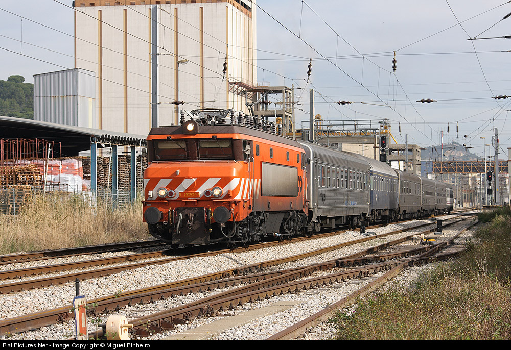 | International night train "SUD Express" between Irún and Lisbon Santa Apolónia passing in a industrial area nearby Lisbon. |