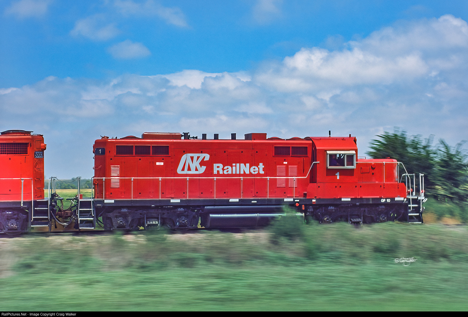 Nebraska Kansas Colorado RailNet GP10 1 (ex-BN GP10 1426, ex-BN GP7 1625, nee-NP 551) & GP30 5003 (ex-NS 558, nee-NW 558) bring a trainload of grain cars east along the railroad’s St. Francis Sub, which is ex-Burlington Northern trackage, and Chicago Burlington & Quincy trackage before that. (Danbury, Nebraska – August 5, 2004)