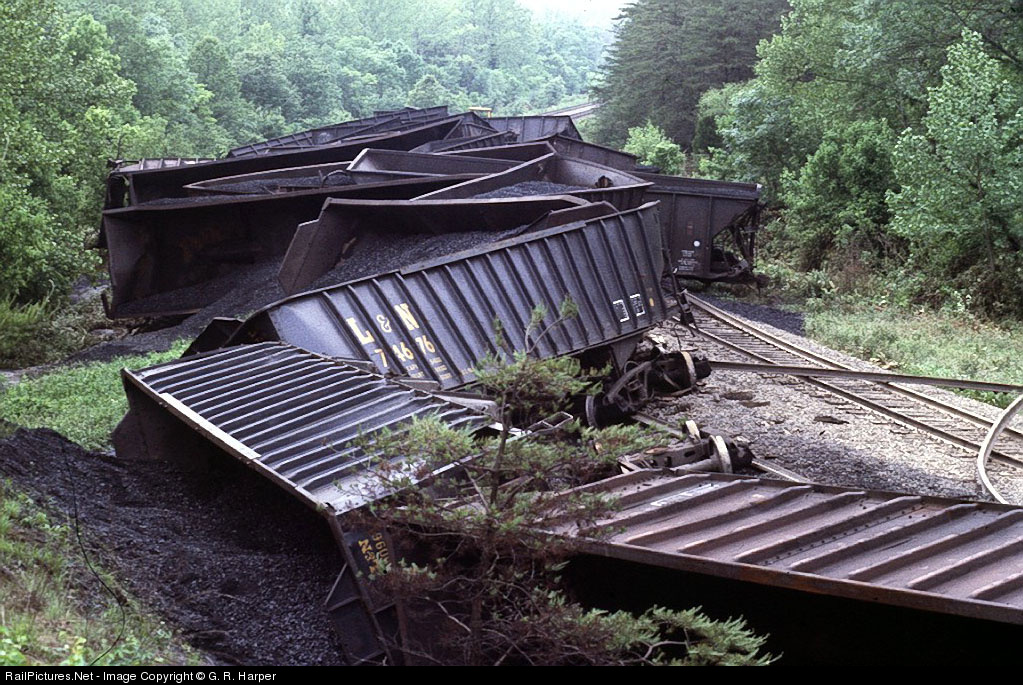 Coal hoppers from train 142 lie zigzagged across the right of way at Gilbert, VA, about 10 miles north of Charlottesville. Torrential rains the night before caused a washout at this location. The locomotives made it across the washout, but the cars immediately following piled up. Had #142 not found this problem, the northbound Crescent, Amtrak #20, would have!!!