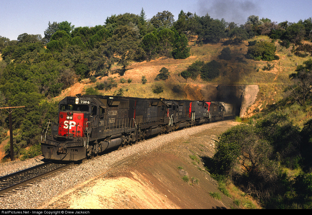 SP rebuilt SD40R has emerged from Tunnel #17 West of Newcastle on the #2 track. Three SD40T2's and an SD45 make up the rest of the lash-up.