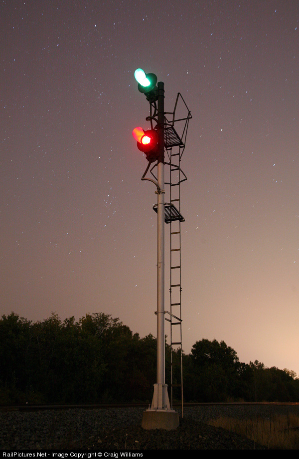 This NYC sytle signal has a high green for an eastbound NS pig train that is following Amtrak eastward tonight. This is CP 491 and is located east of Miller along hiway 12.
