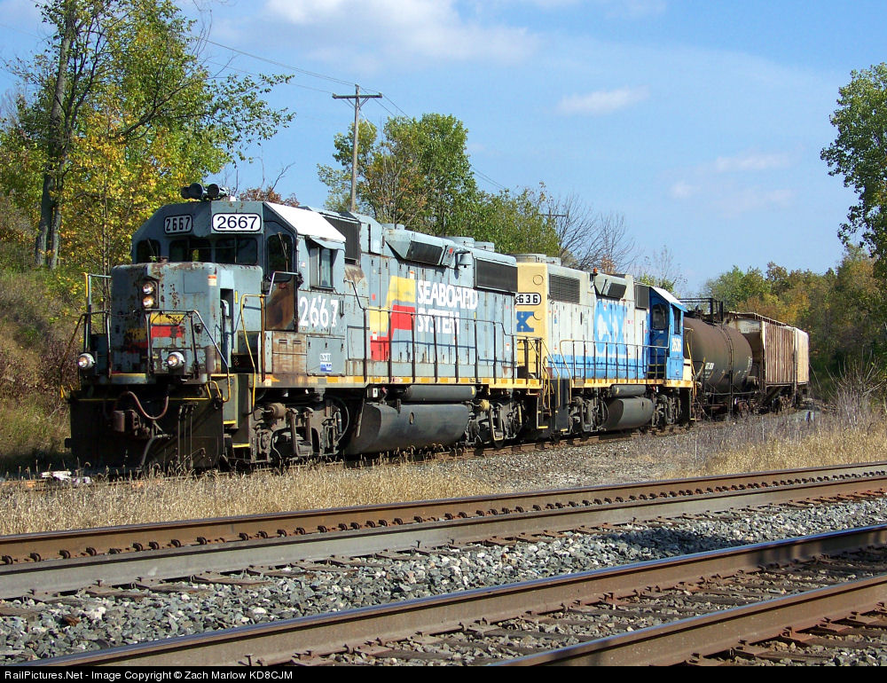 CSXT 2667, the last Seaboard painted unit on CSX seen here backing onto the Old Sidney Main at Spafford on the west side of Sidney