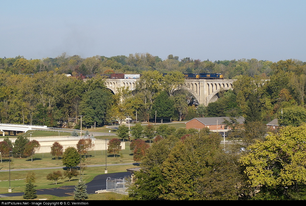 October fall colors are finally showing in Sidney, Ohio. CSX X364 passes over Sidney on this long and impressive bridge.