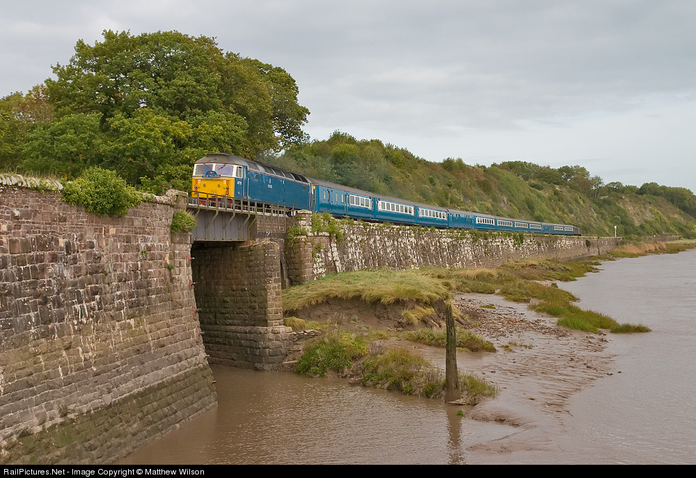 | The FM Rail operated Blue Pullman went for a day out at the Dean Forest railway, ctopping at the mainline station in Lydney to drop the diners off. The train is seen nearing journeys end as it skirts the Severn Estuary |