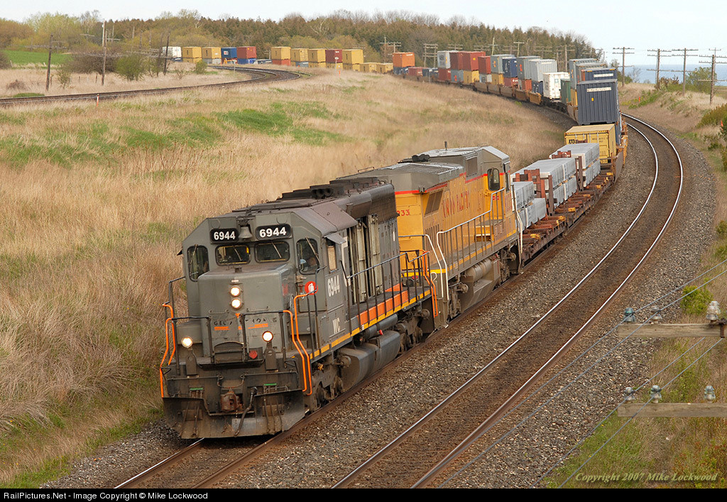 With foreign power quite rare east of Toronto, an unexpected and welcome sight rounds the bend as WC 6944 leads UP 9233 and CN train 149 at Lovekin, Ontario. Though the WC's are not uncommon, the UP unit (clean paint, too) is a good catch since most of the "interesting" stuff gets turned back towards Chicago at Toronto. Update: With the WC 6900 series SD40-3's leases expiring in March 2008, they are being parked in Chicago until they are returned. Virtually the entire fleet is out of service as of mid-December 2007. 1725hrs.