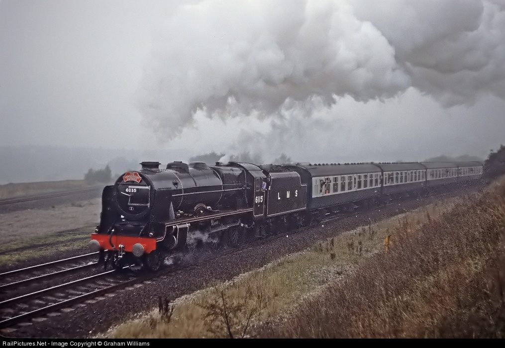 A rare photograph. The handsome Royal Scot class no. 6115 Scots Guardsman at New Mills in 1978 on a main line special. Because of the thick fog, not many people took pictures at that time. Apparently, because the mechanical condition of the locomotive was not top-notch, British Rail only ever allowed it to make two main line runs. It has not run on the main line since, but is now under restoration at Carnforth with a view to a return to the main line. My 100th RailPictures photo.