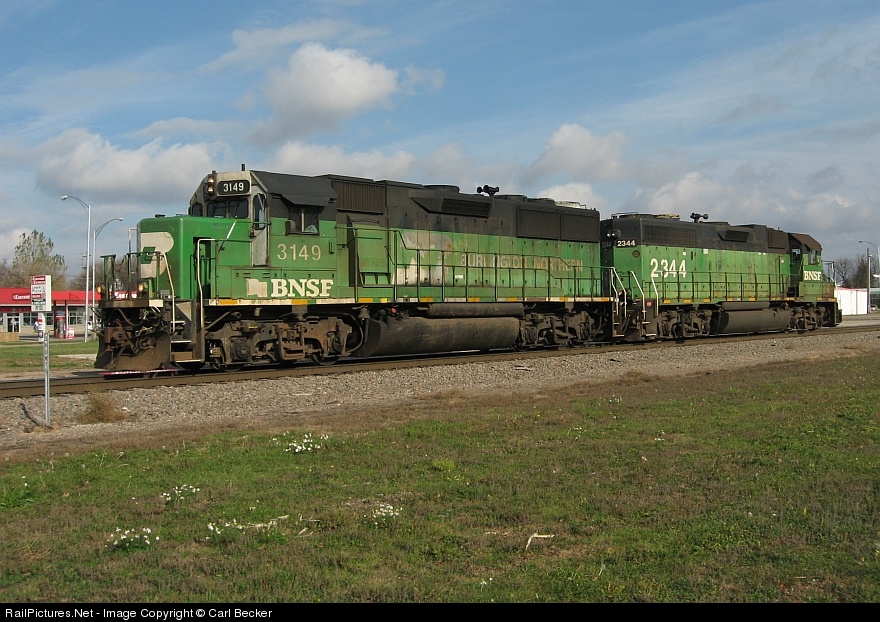 With her Burlington Northern treatment and herald still intact on the long hood, BNSF 3149, one of 53 remaining ex-BN GP50s, leads a light power movement back westward after interchanging a baretable train with the Minnesota Northern Railroad in Crookston, MN. She sounded pretty nice rolling through downtown East Grand Forks at track speed!
