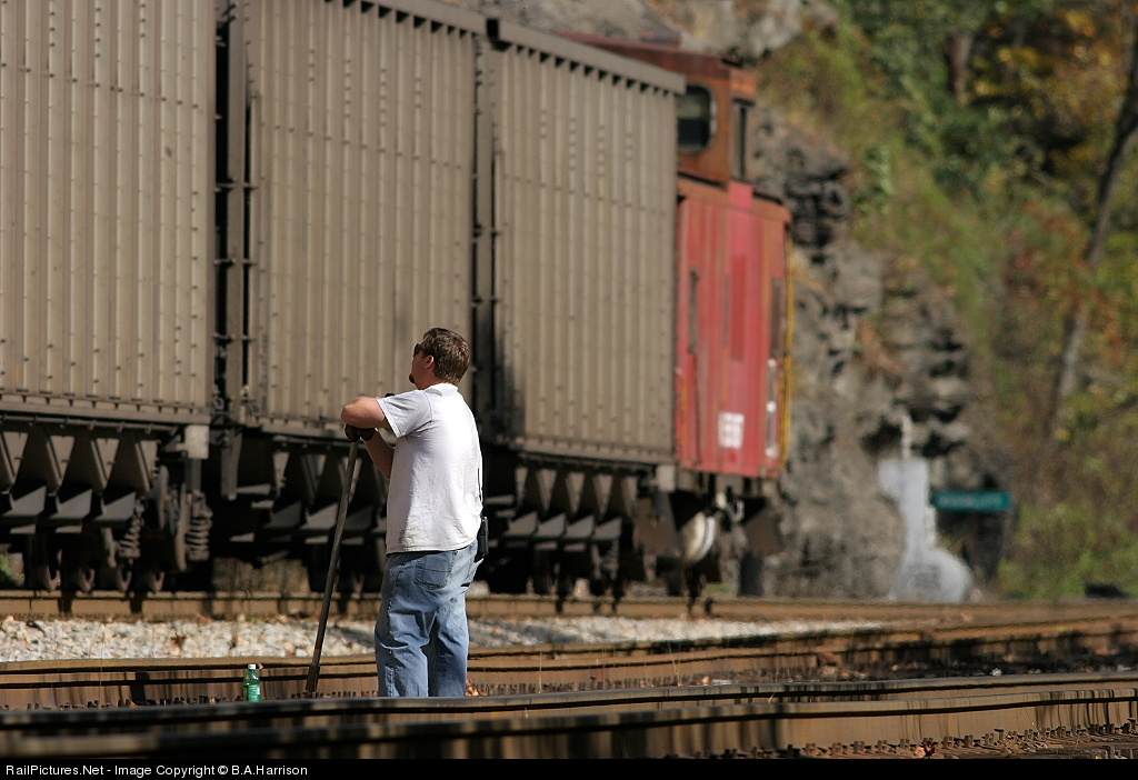 | Preparing to climb aboard the caboose and back up the Gilbert Branch to Bens Creek, a brakeman does a rollby as minerun U98 eases up to the switch. Cabs are still in use on most Pocahontas branches in this modern time. |