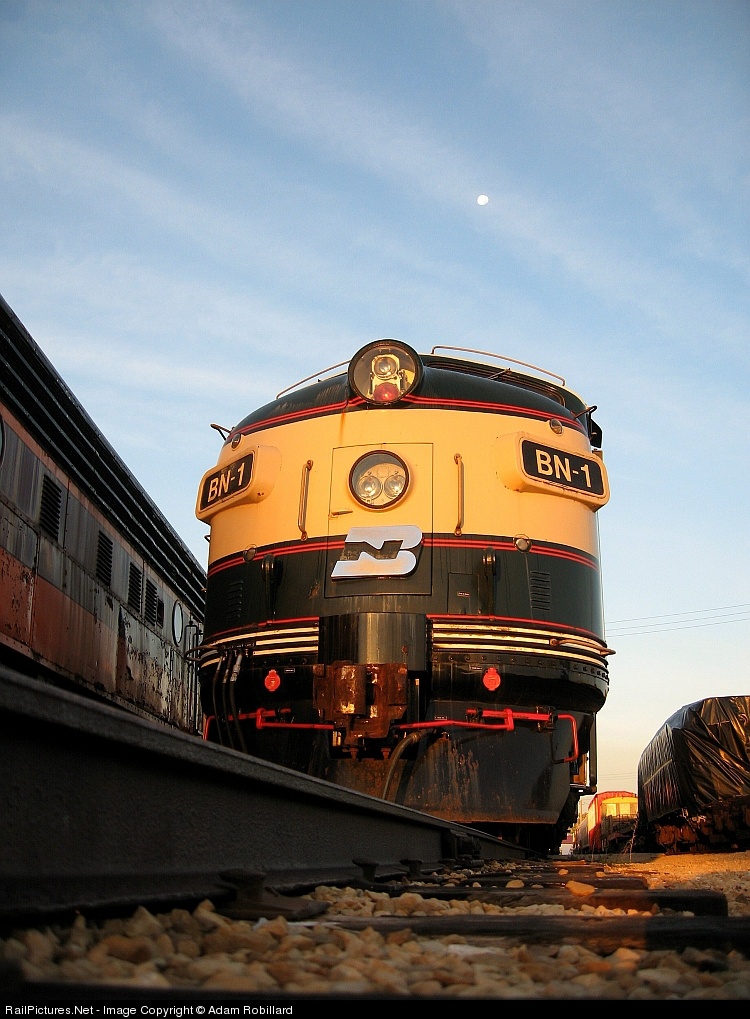 BN-1 sits in yard 5 showing its battle scars in the morning light. The moon is still in the sky. All three of the BN's passenger executive units are at IRM.