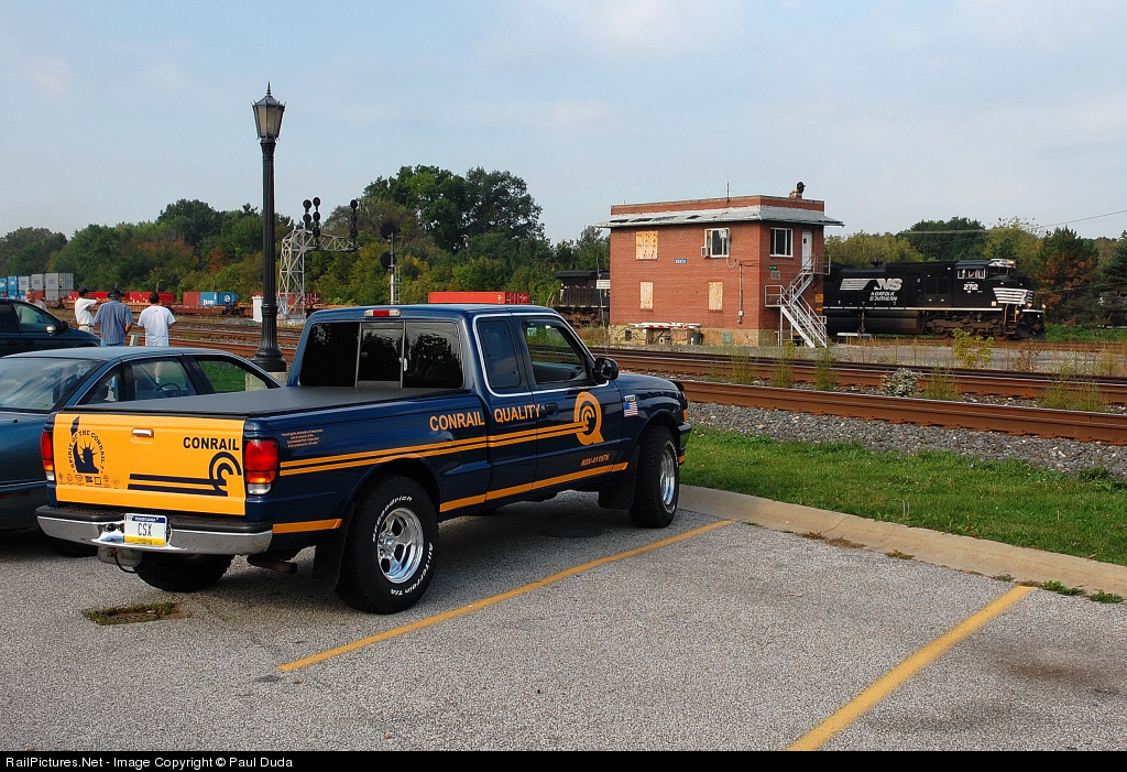 20R heads past BE tower and a Conrail Quality painted truck, only in CSX's Dark Future colors