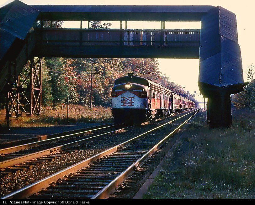 The YANKEE CLIPPER at full speed passing under the famous pedestrian overpass at Wickford Junction. This structure was moved in one piece to Route 128 station in the late 60’s and remained the only way to reach the eastbound trains until the rebuilding by Amtrak.