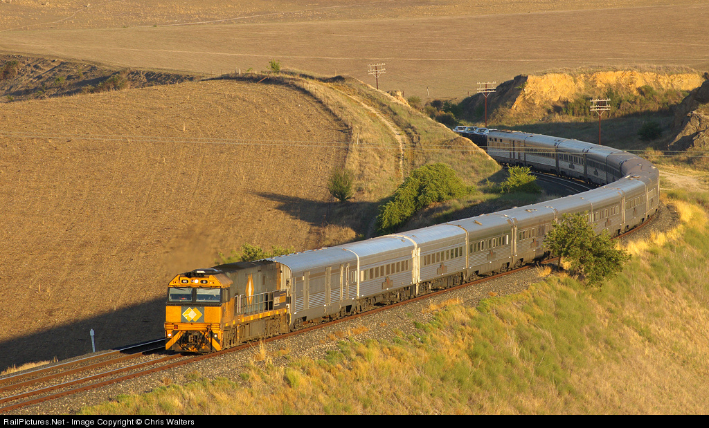 | NR13 brings No. 6AS8, the Perth-Sydney Indian Pacific, down hill into Locksley, between Bathurst and Lithgow. |