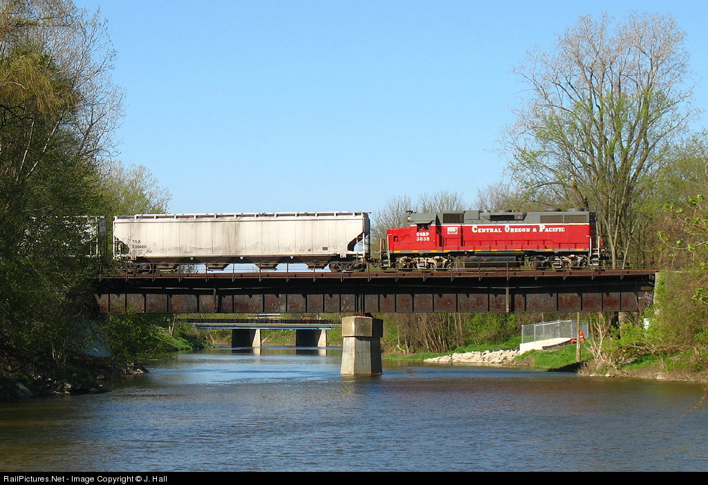 CORP 3838 leads its' train across the Cass River as 810 departs for Caro.