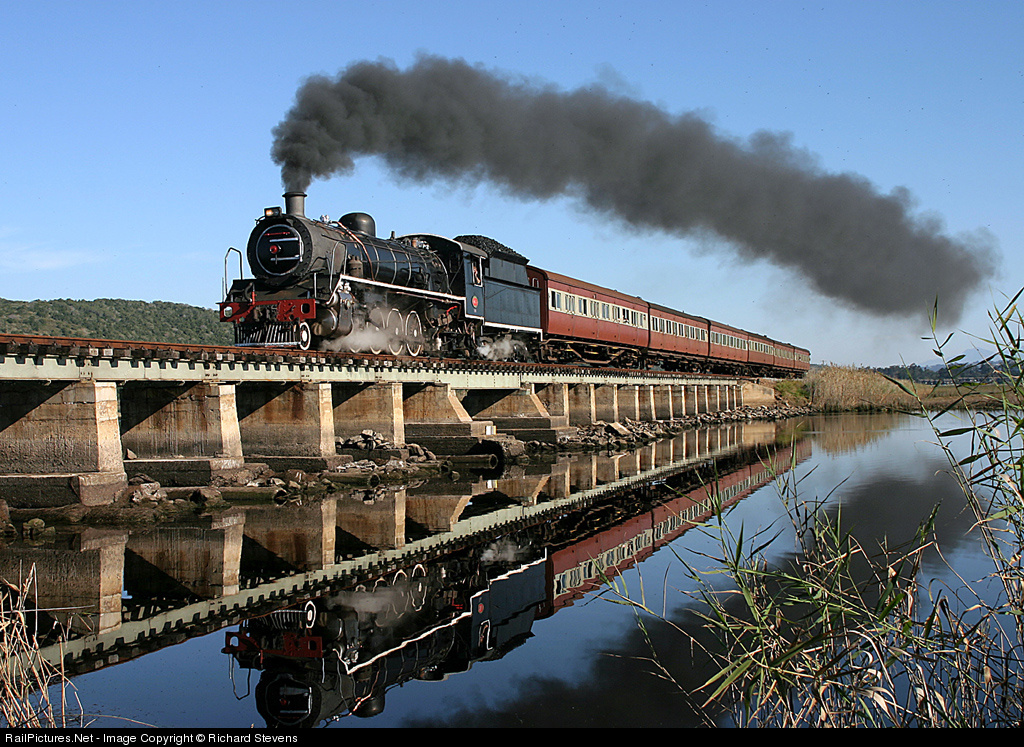 The scheduled steam passenger service from George to Knysna crosses the trestle at Swartvlei. Two months after this picture was taken, the line suffered severe storm damage and has been closed ever since, with steam operations transferred to the George to Mossel Bay line.