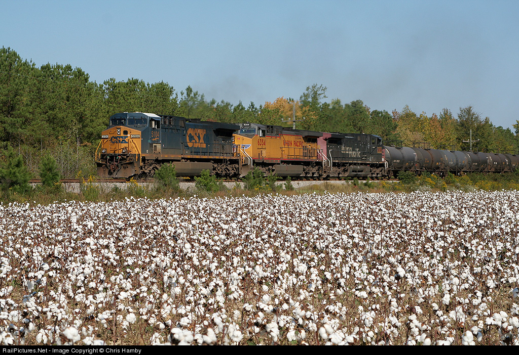 CSX AC4400CW #5104 passes a field of cotton as it gets back up to speed after waiting for the north bound juice train to pass.